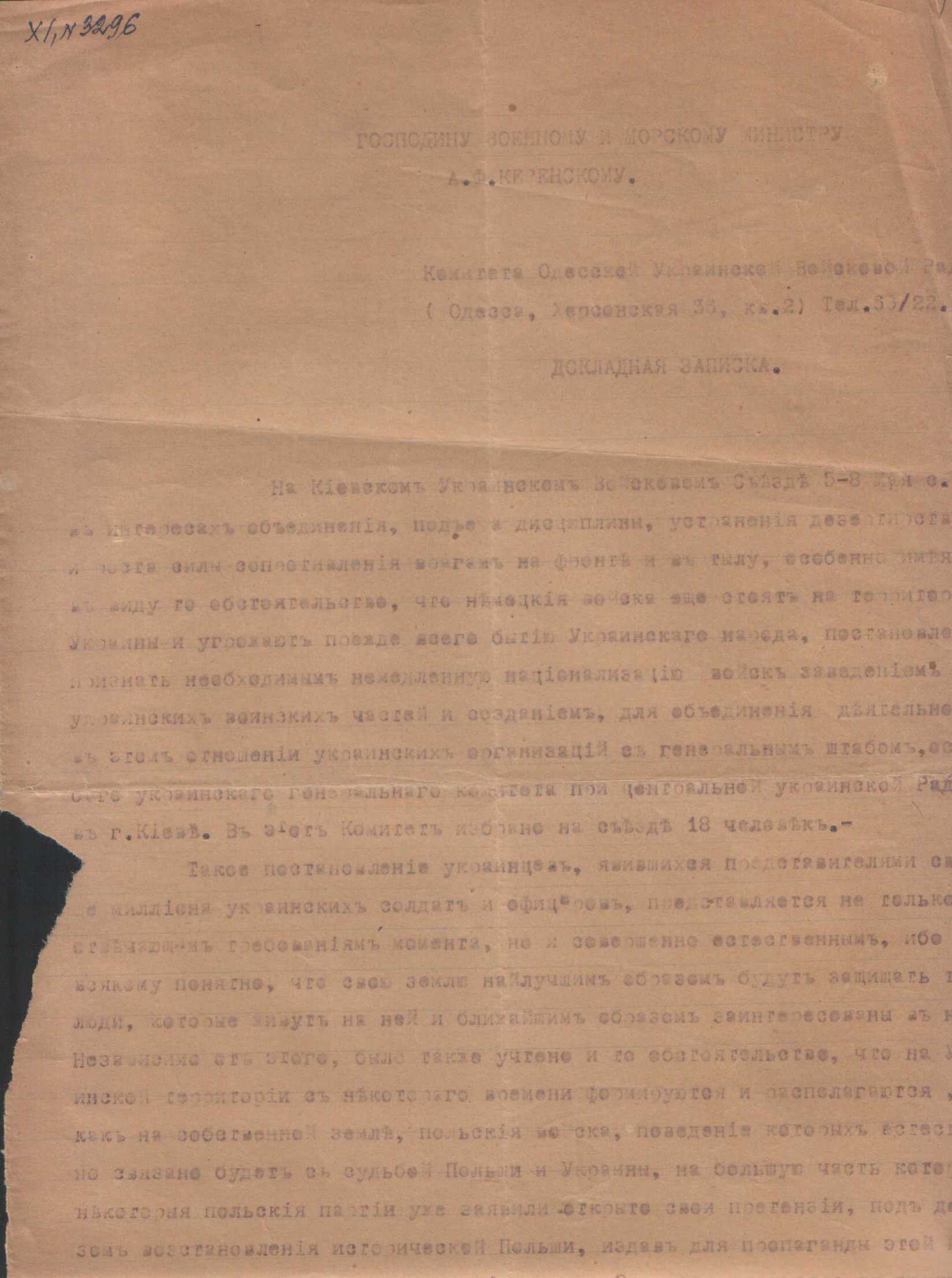 88. Комітет Одеської Української військової ради – військовому і морському міністру юстиції О.Ф. Керенському. Доповідна записка щодо необхідності формування української військової частини для захисту від загрози німецьких та польських військ та проханням надати допомогу. З Одеси до Петербургу, травень 1917 р. (ІР НБУВ, ф. ХІ, од. зб. 3296)