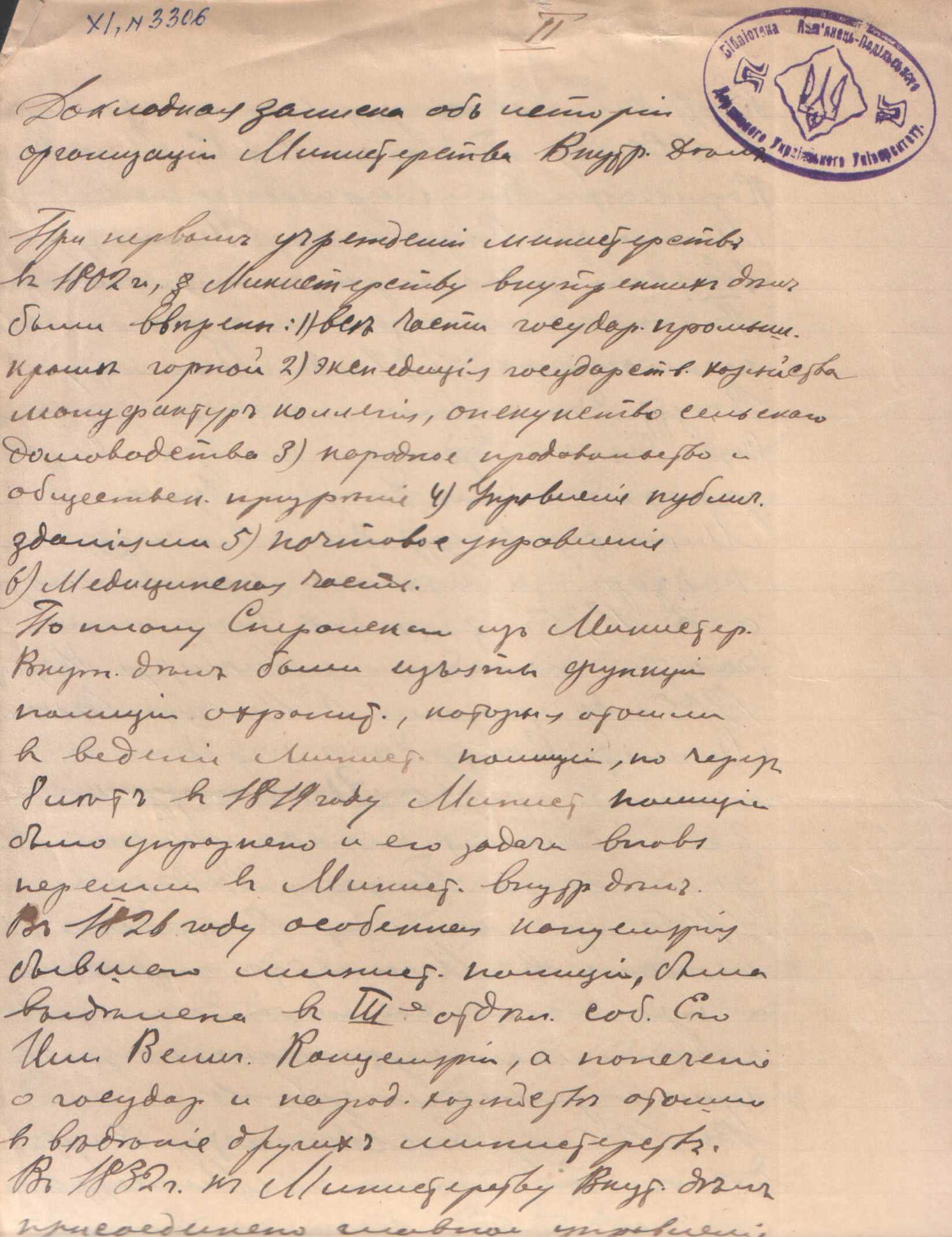 89. Доповідна записка щодо історії організації Міністерства внутрішніх справ. Примітка: на документі штемпель «Бібліотека Кам’янець-Подільського державного українського університету». (ІР НБУВ, ф. ХІ, од. зб. 3306)