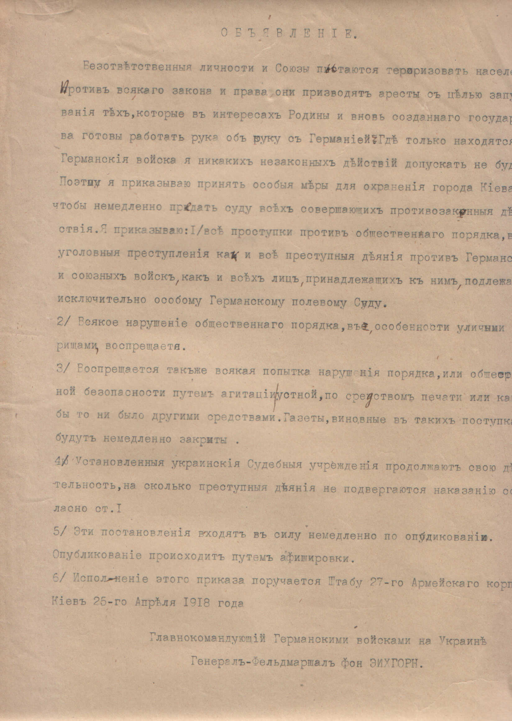 90. Генерал-фельдмаршал фон Ейхгорн, головнокомандуючий германськими військами на Україні. Об’ява наказу про притягнення до судової відповідальності усіх громадян, які порушують громадський порядок у місцях розташування німецьких військ. Київ, 25 квітня 1918 р. (ІР НБУВ, ф. ХІ, од. зб. 3316)