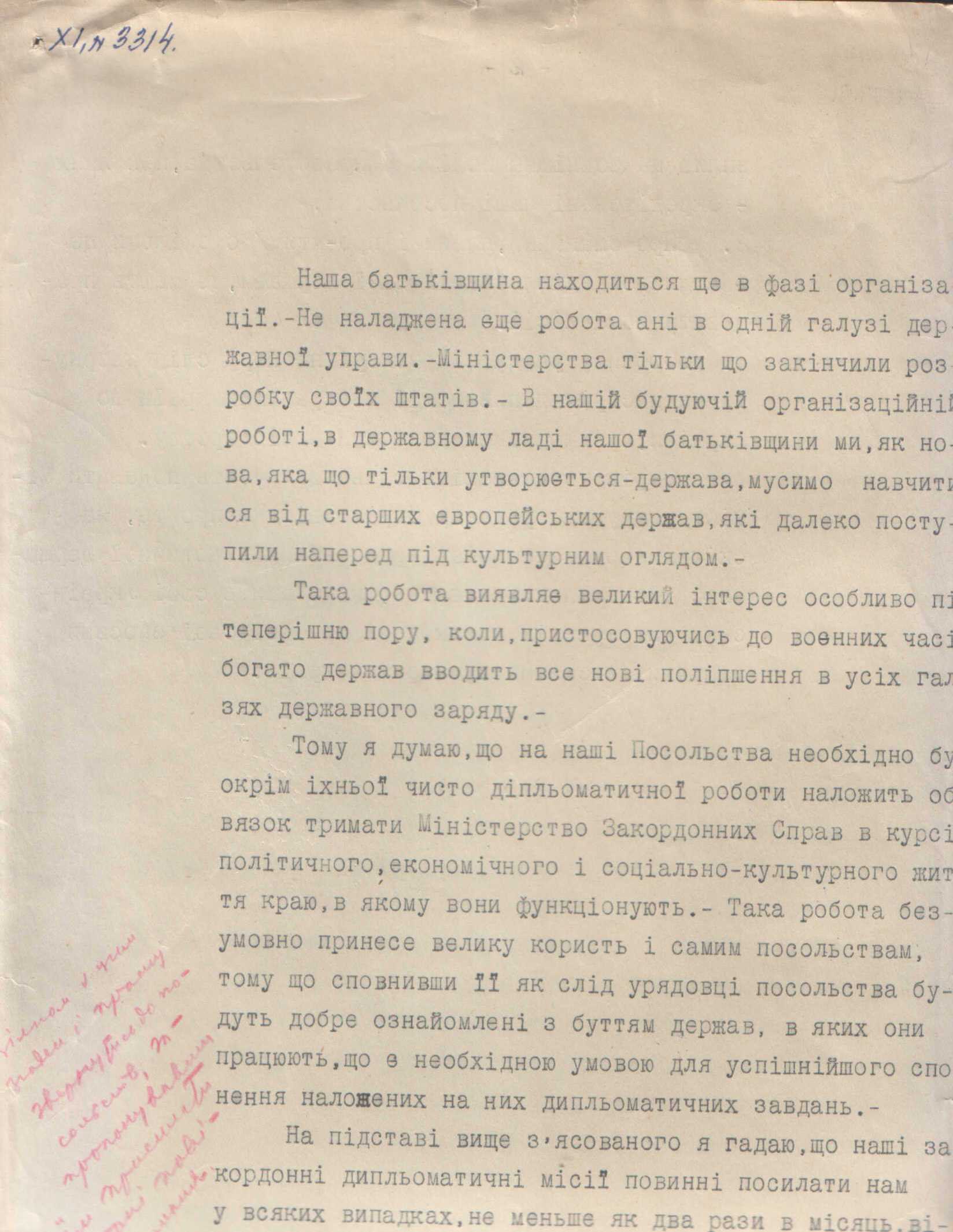 68. Дорошенко Д., управляючий. Структура Міністерства закордонних справ. Уривок документу. [Київ, 1918 р.] (ІР НБУВ, ф. ХІ, од. зб. 3444)