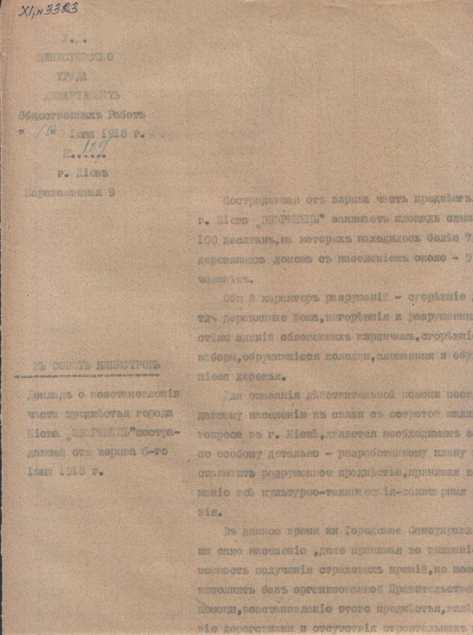 93. Міністерство праці Української Держави. Документи щодо питання відновлення частини міста Києва «Звіринець», який постраждав внаслідок вибуху 6 червня 1918 р. Київ, 10 червня 1918 р. (ІР НБУВ, ф. ХІ, од. зб. 3323)