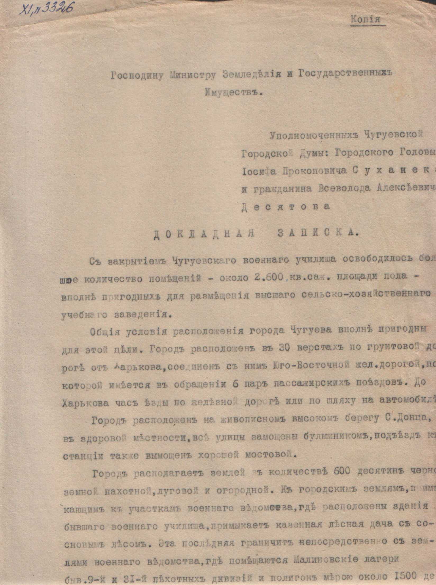 94. Суханек Йосип Прокопович, міський голова, уповноважений Чугуєвської міської думи – міністру землеробства та державного майна. Доповідна записка з проханням переміщення Ново-Олександрійського сільськогосподарчого інституту до міста Чугуєва. Чугуїв, 30 червня 1918 р. (ІР НБУВ, ф. ХІ, од. зб. 3326)