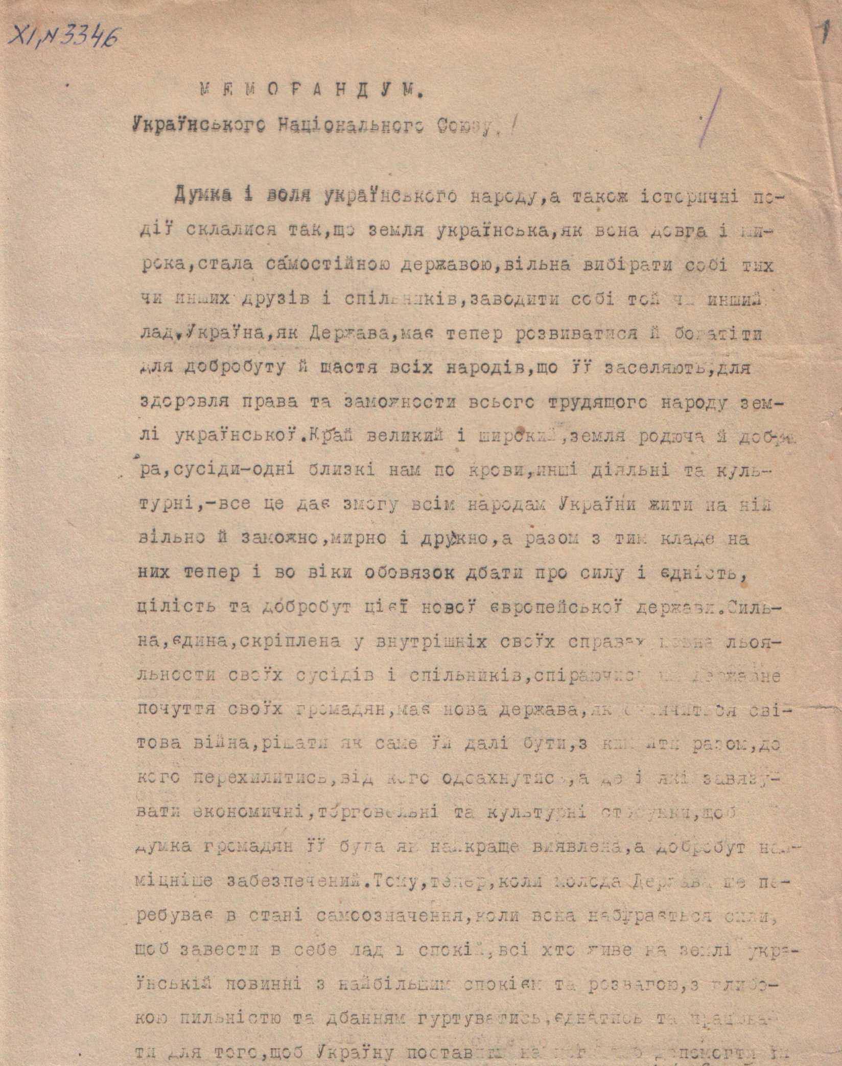 95. Андрій Ніковський, голова Українського Національного Союзу. Меморандум про політичні справи в Україні в період урядування УНР. Київ, серпень 1918 р. (ІР НБУВ, ф. ХІ, од. зб. 3346)