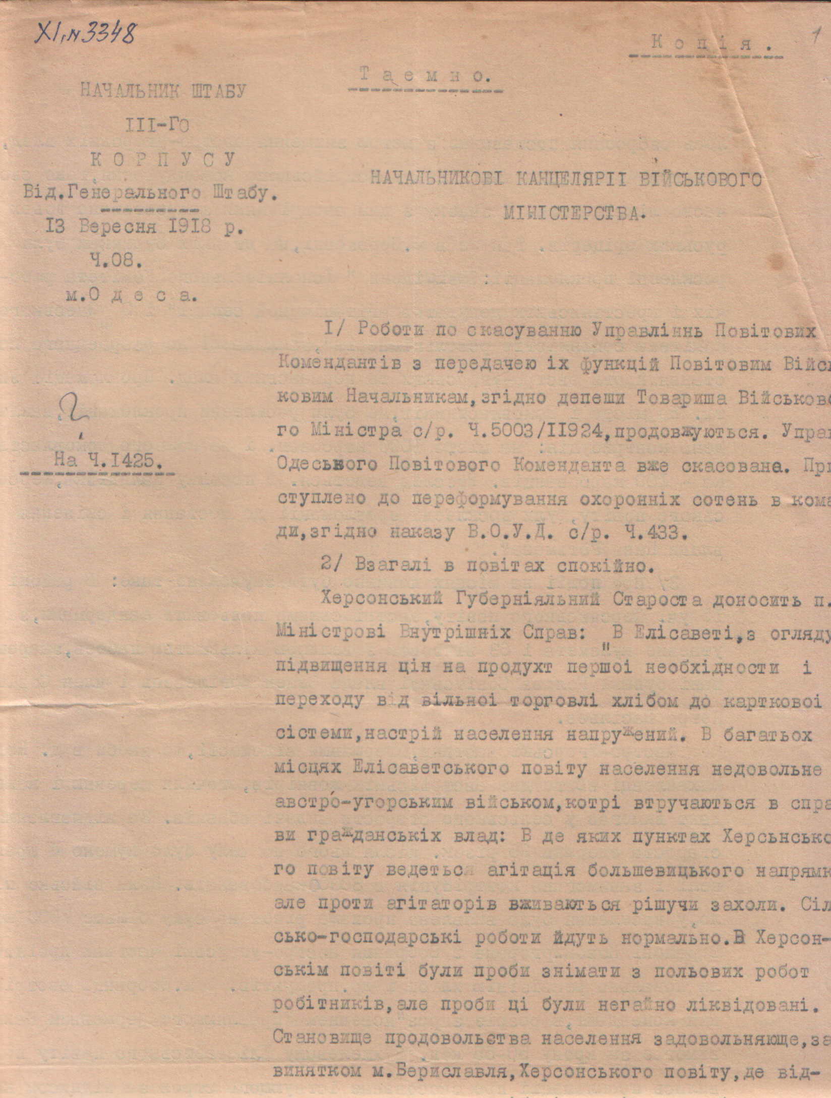 96. Генеральний хорунжий Ізергін, начальник штабу, полковник Воробйов, голова відділу Генерального штабу – начальникові Канцелярії Військового міністерства. Звідомлення про пограбування та знущання над місцевим населенням австро-угорськими військами. Під грифом «Таємно». Одеса, 13 вересня 1918 р. (ІР НБУВ, ф. ХІ, од. зб. 3348)
