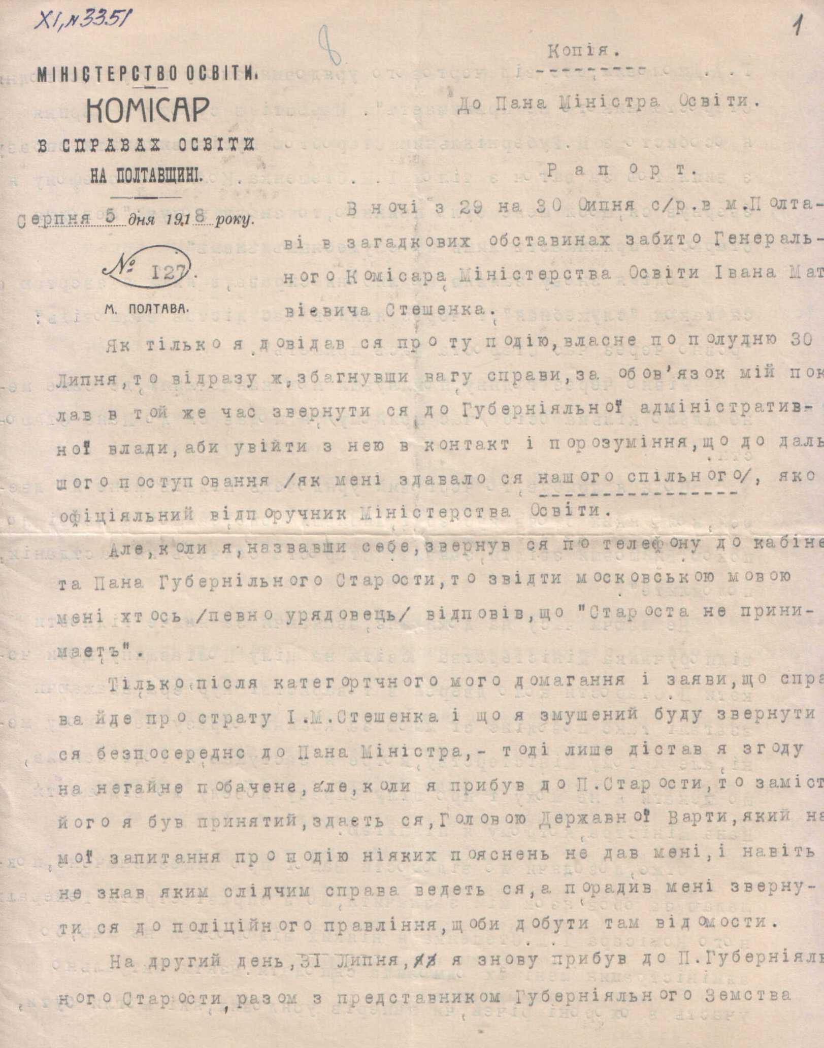 97. Полтавський губернський комісар у справах освіти В. Андрієвський – Міністру освіти Української Держави. Листи про страту генерального комісара Івана Матвійовича Стешенка. Полтава, 5 серпня, 30 вересня 1918 р. (ІР НБУВ, ф. ХІ, од. зб. 3351-3352)