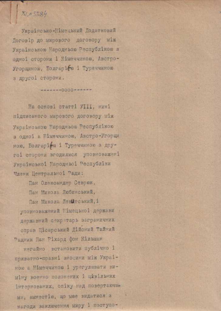 66. Шелухин С.П. Українсько-німецький додатковий договір до Мирового договору між Українською Народною Республікою з однієї сторони і Німеччиною, Австро-Угорщиною, Болгарією і Туреччиною з другої сторони. [Київ, 1918 р.]. Додаток: Протест проти окупації Галичини поляками, адресований Климаню Жаржу. 15 липня 1919 р. Франц. мовою. (ІР НБУВ, ф. ХІ, од. зб. 3384)