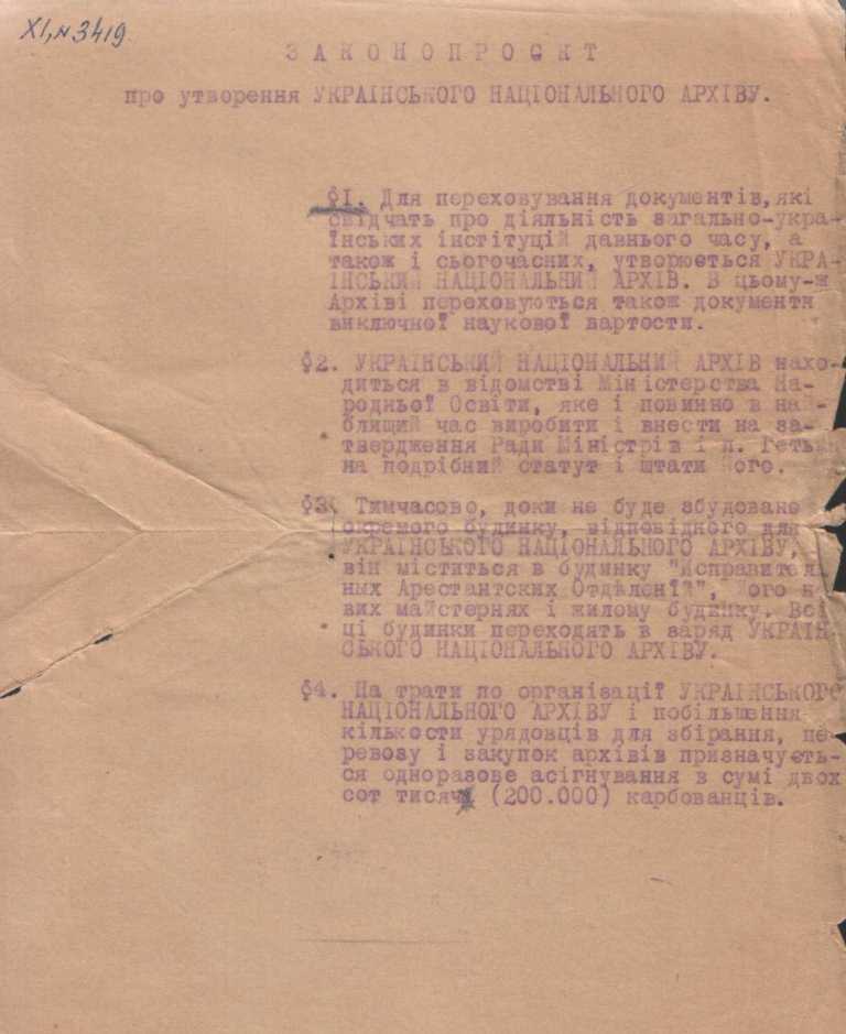 67. Законопроєкт про утворення Українського національного архіву. [Київ, 1918 р.] (ІР НБУВ, ф. ХІ, од. зб. 3419)