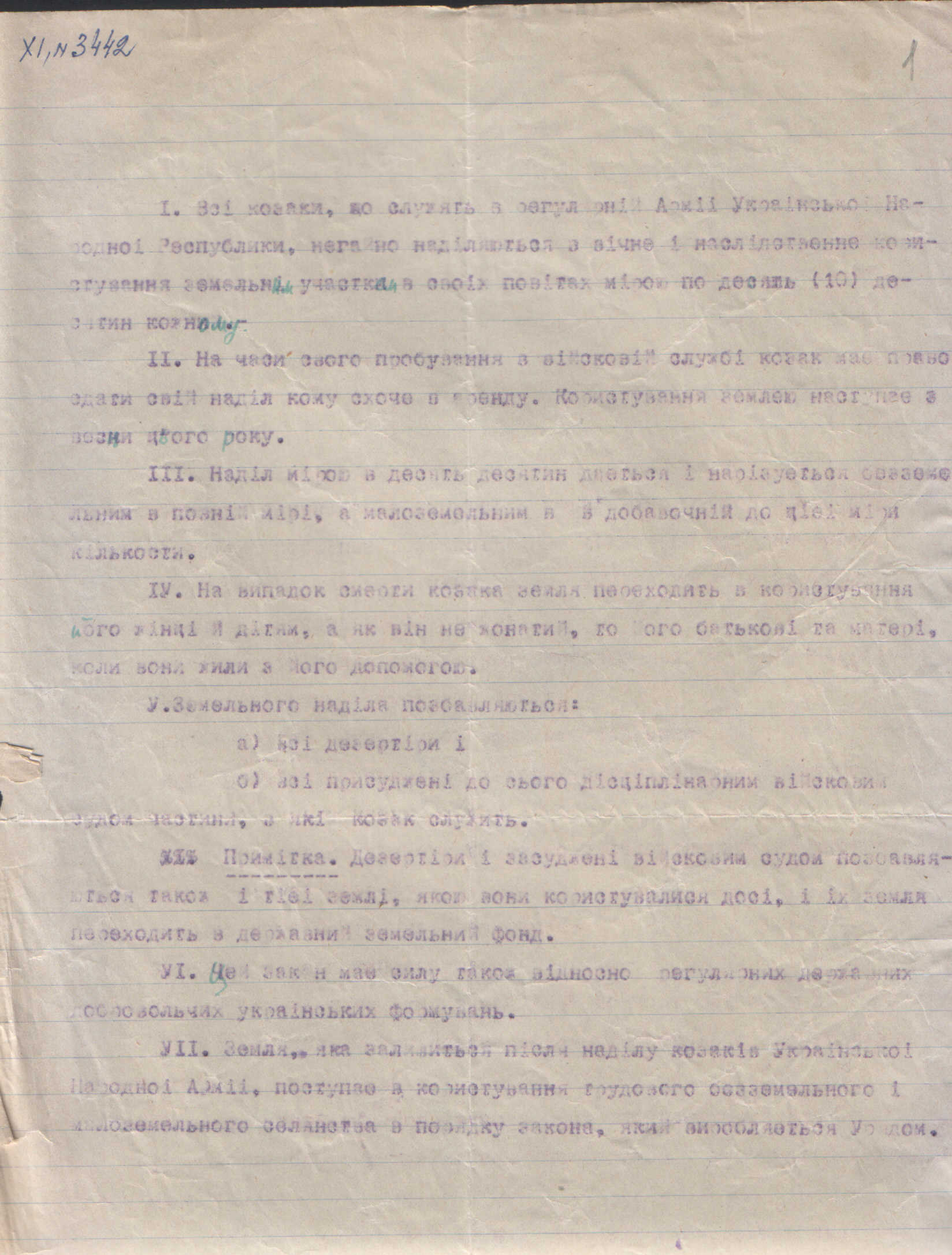 77. Розпорядження «Про наділ землею козаків, які служать в регулярній армії Української Народної Республіки» [Київ, 1918 р.] (ІР НБУВ, ф. ХІ, од. зб. 3442)