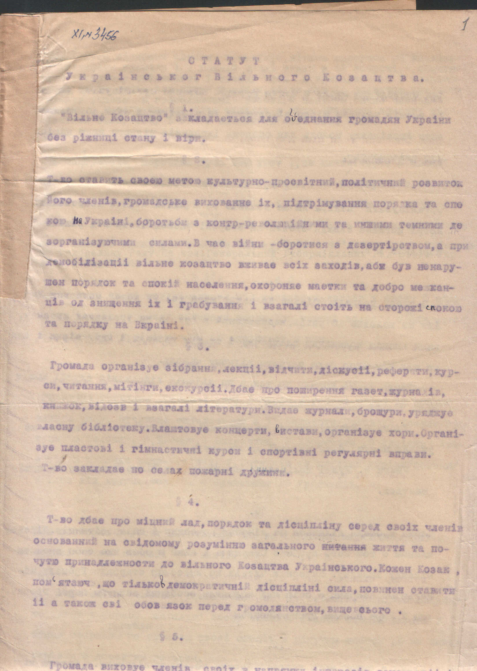 75. Статут Українського вільного козацтва [Київ, 1918 р.] (ІР НБУВ, ф. ХІ, од. зб. 3456)