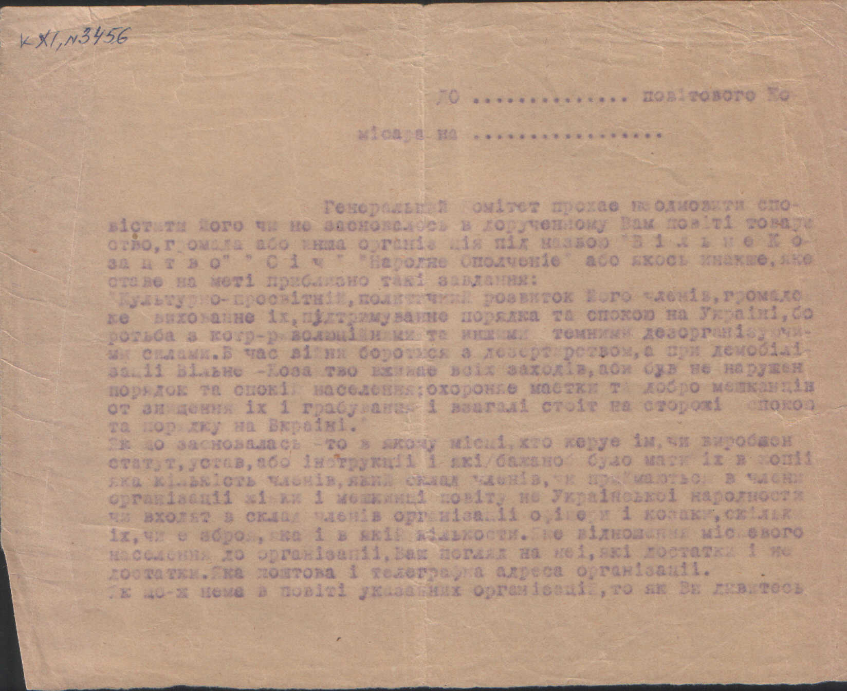 76. Звернення Генерального комітету Українського вільного козацтва до повітових комісарів з проханням повідомити про утворення товариств громад під назвою «Вільне козацтво», «Січ», «Народне ополчення», метою діяльності яких є культурно-просвітний та політичний розвиток його членів, а також підтримання порядку і спокою в Україні [Київ, 1918 р.] (ІР НБУВ, ф. ХІ, од. зб. 3456)