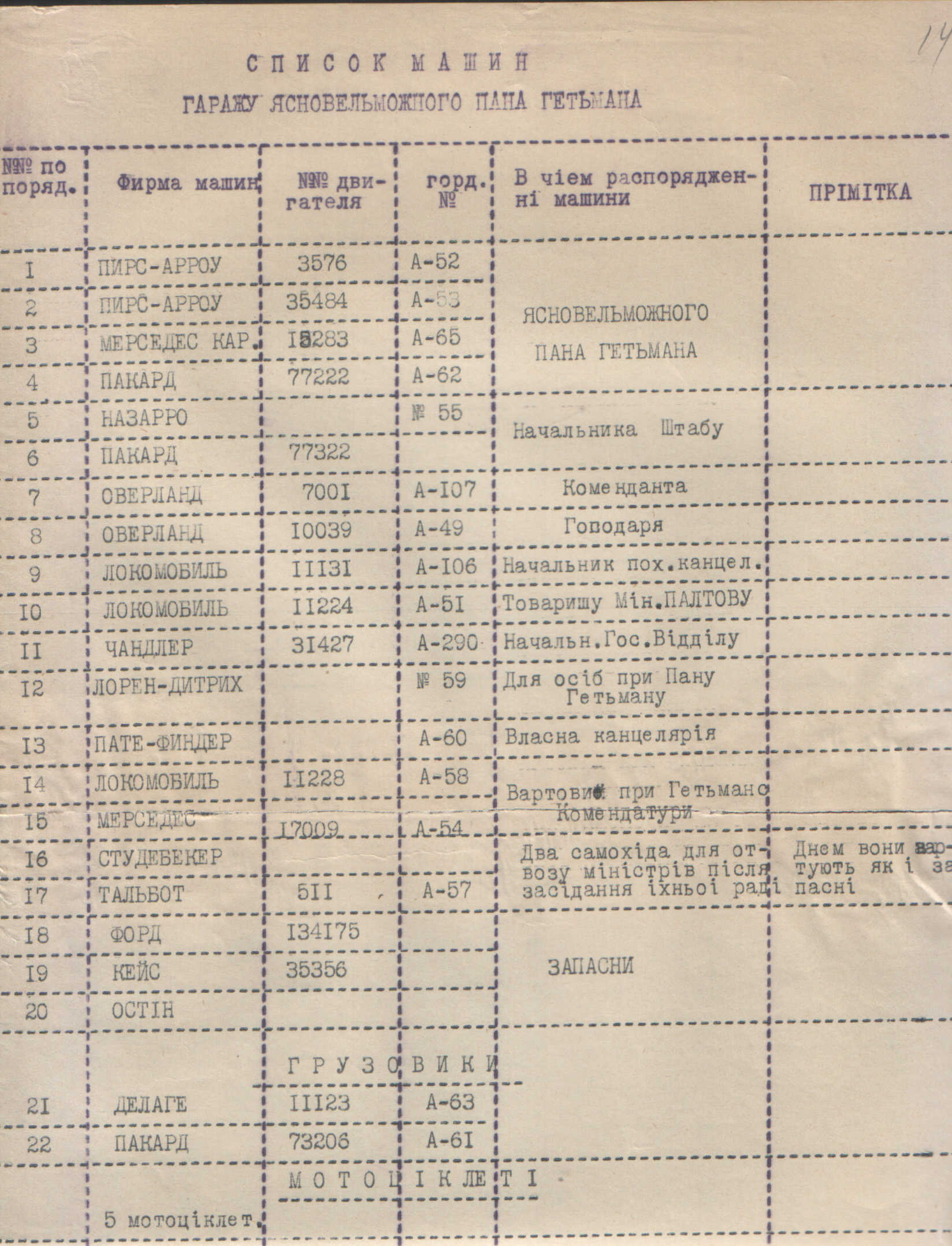 73. Список автівок гаражу ясновельможного пана Гетьмана (Державної канцелярії). [Київ, 1918 р.] (ІР НБУВ, ф. ХІ, од. зб. 3458)