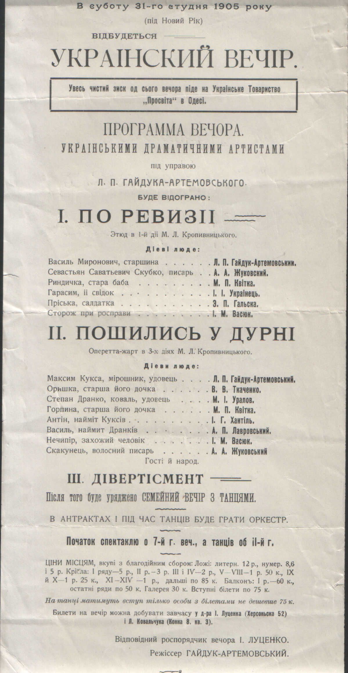 23. Програма Українського вечора під орудою Українського товариства «Просвіта» та Л.П. Гайдука-Артемовського. Одеса, 31 січня 1905 р. (ІР НБУВ, ф. ХІ, од. зб. 3465)