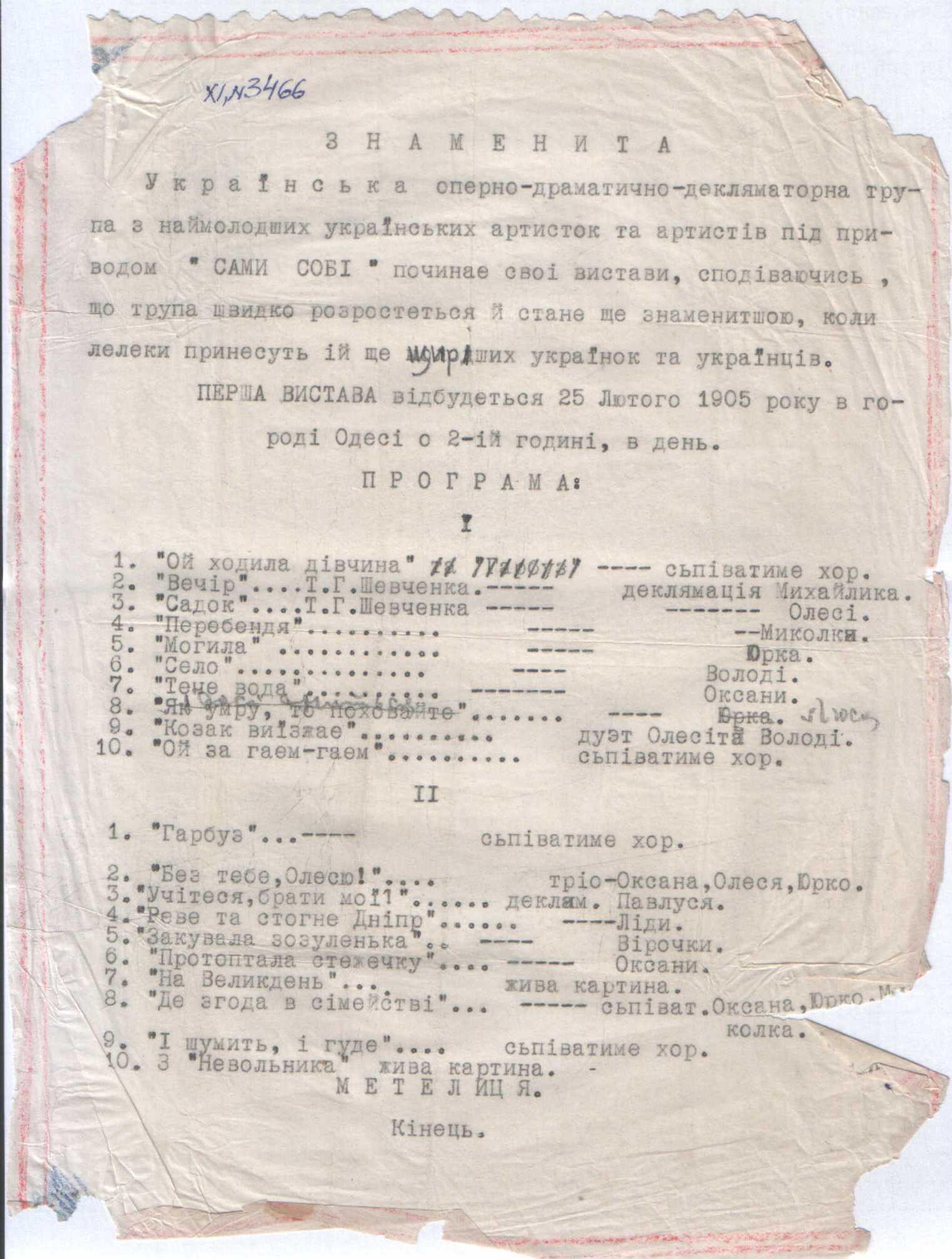 22. Програма вечора української оперно-драматично-декламаторської трупи з наймолодших українських артисток та артистів «Самі собі». Примітка: [у складі трупи діти С.П. Щелухіна]. Одеса, 25 лютого 1905 р. (ІР НБУВ, ф. ХІ, од. зб. 3466)