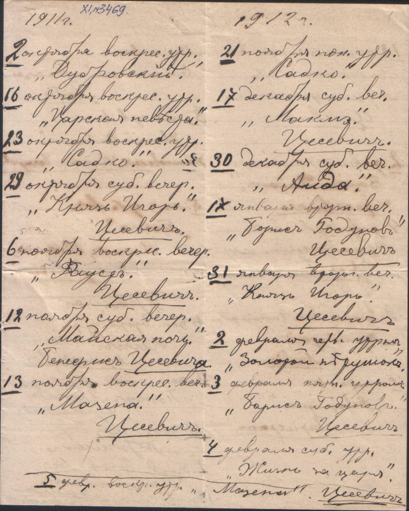 47. Репертуар Одеського оперного театру на 1911–1912 рр. Автограф. (ІР НБУВ, ф. ХІ, од. зб. 3469)