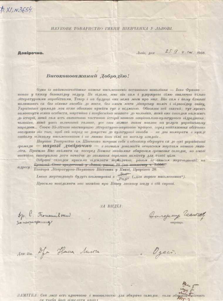 24. Володимир Гнатюк, секретар Наукового товариства імені Шевченка у Львові – Івану Липі. Оголошення про збір пожертв для хворого Івана Франка. Львів, 25 вересня 1908 р. (ІР НБУВ, ф. ХІ, од. зб. 3654)