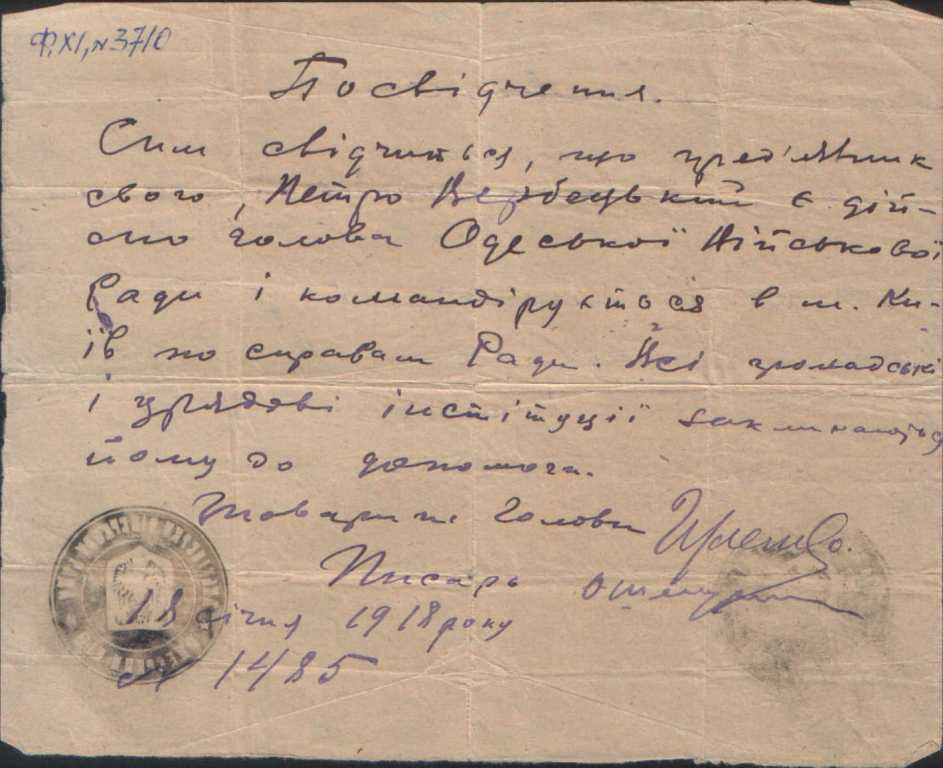 81. Посвідчення, видане Петру Вербецькому в тому, що він є головою Одеської військової ради. Одеса, 18 січня 1918 р. (ІР НБУВ, ф. ХІ, № 3710)