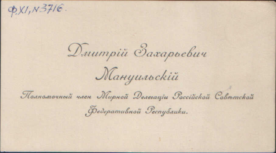 83. Мануїльський Дмитро Захарович, повноважний член Мирної делегації російської радянської федеративної республіки. Візитна картка. 1918 р. (ІР НБУВ, ф. ХІ, № 3716)