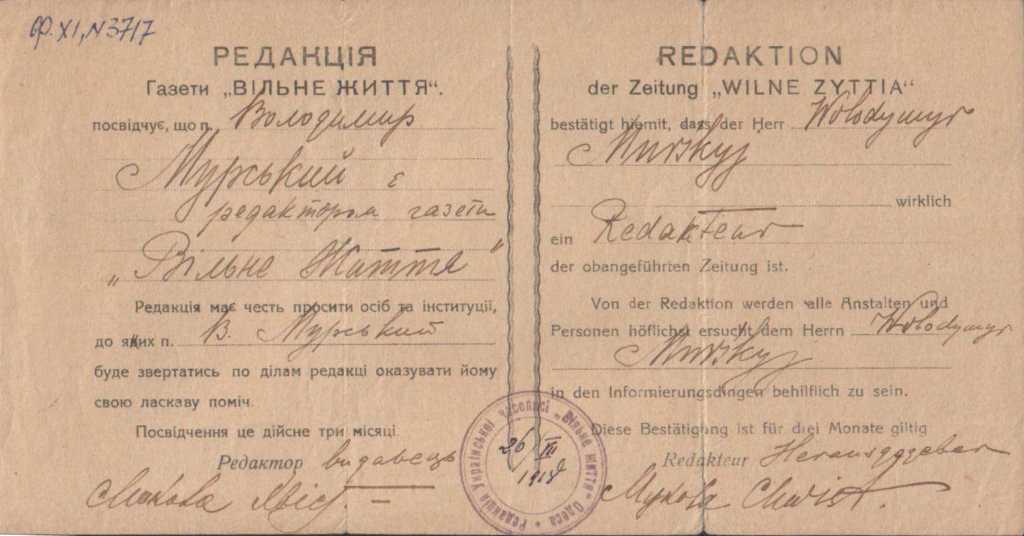 82. Мурський Володимир. Посвідчення редактора одеської газети «Вільне життя». Одеса, 26 липня 1918 р. Укр. та нім. мовами. (ІР НБУВ, ф. ХІ, № 3717)