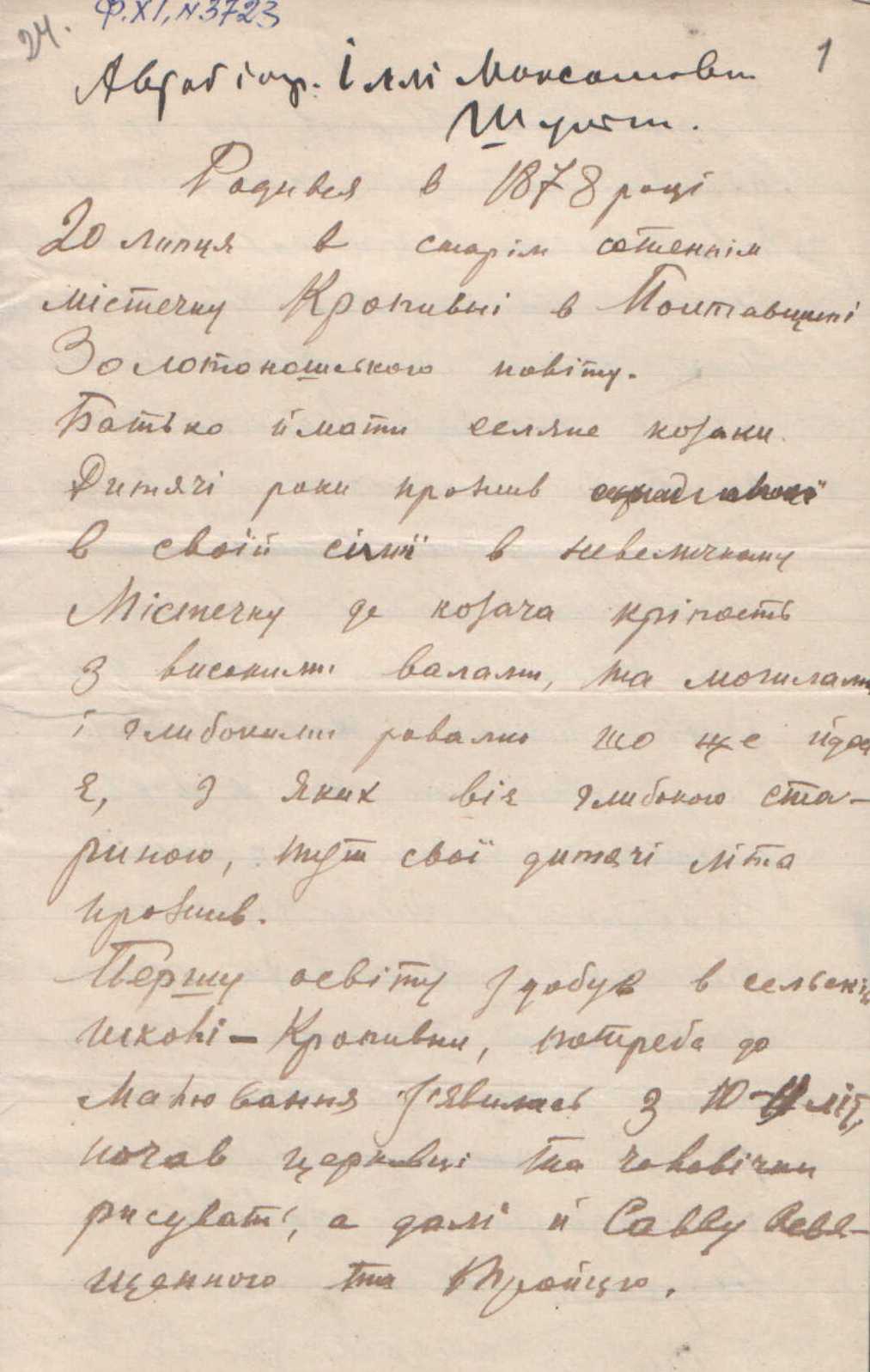 80. Автобіографія художника Іллі Максимовича Шульги. [Київ, 1909 р.] (ІР НБУВ, ф. ХІ, од. зб. 3723)