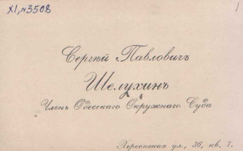 5. Візитна картка Шелухина Сергія Павловича – члена Одеського окружного суду. Одеса, [1902] р. (ІР НБУВ, ф. ХІ, од. зб. 3508)