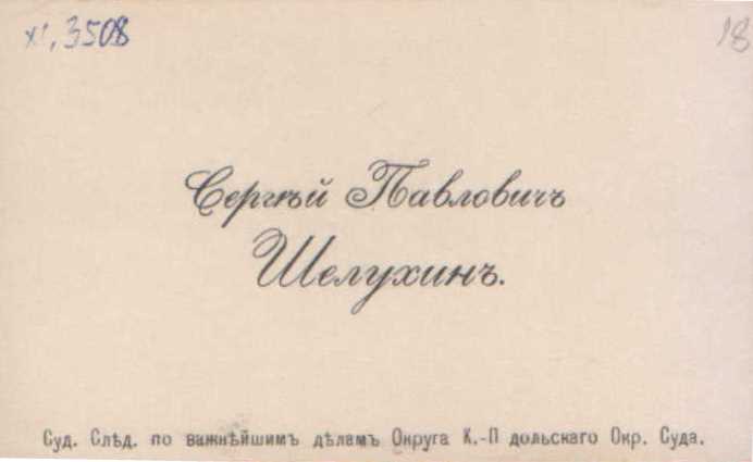 6. Візитна картка Шелухина Сергія Павловича – судового слідчого з особливих справ Кам’янець-Подільського окружного суду. Кам’янець-Подольськ, [1897] р. (ІР НБУВ, ф. ХІ, од. зб. 3508)