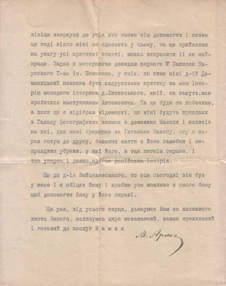 25. Аркас Микола – Шелухину Сергію Павловичу. Листи. З Миколаїва до Одеси. 27 грудня 1906 – 21 березня 1908 р. У листі згадуються: Іван Мазепа та Липинський. Авторизований машинопис. (ІР НБУВ, ф. ХІ, од. зб. 622-623)