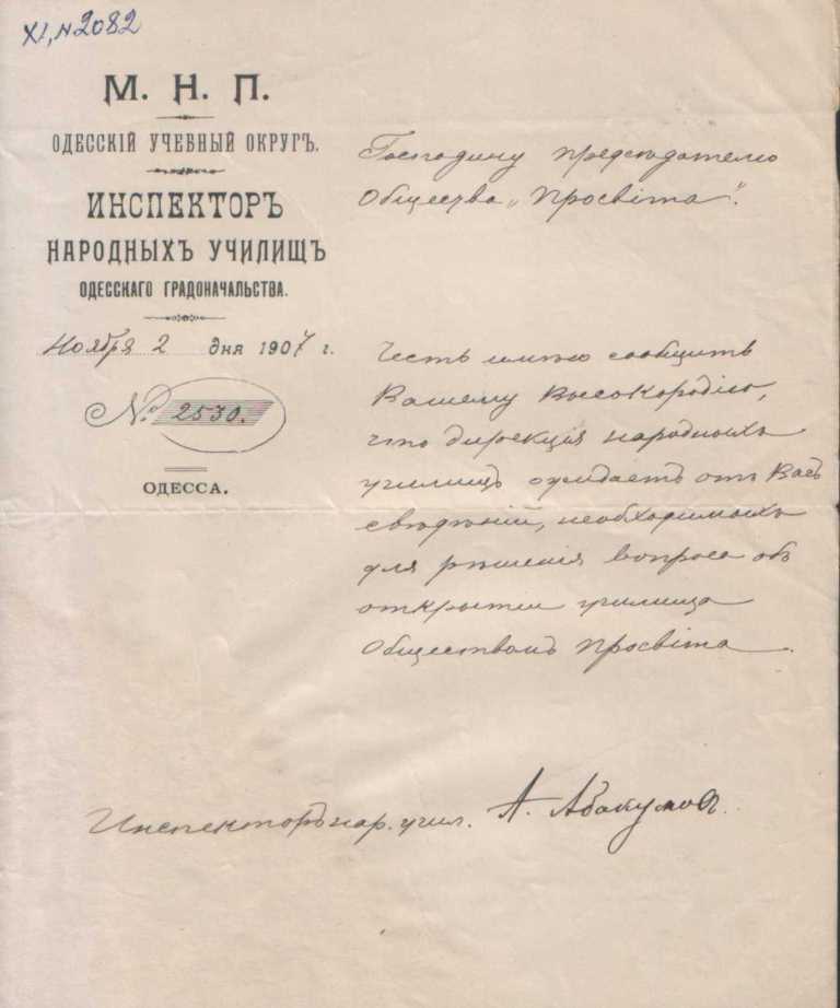 31. Абакумов А. – Шелухину С.П. Прохання про сприяння у відкритті училища товариства «Просвіта». Одеса, 2 листопада 1907 р. (ІР НБУВ, ф. ХІ, од. 2082)