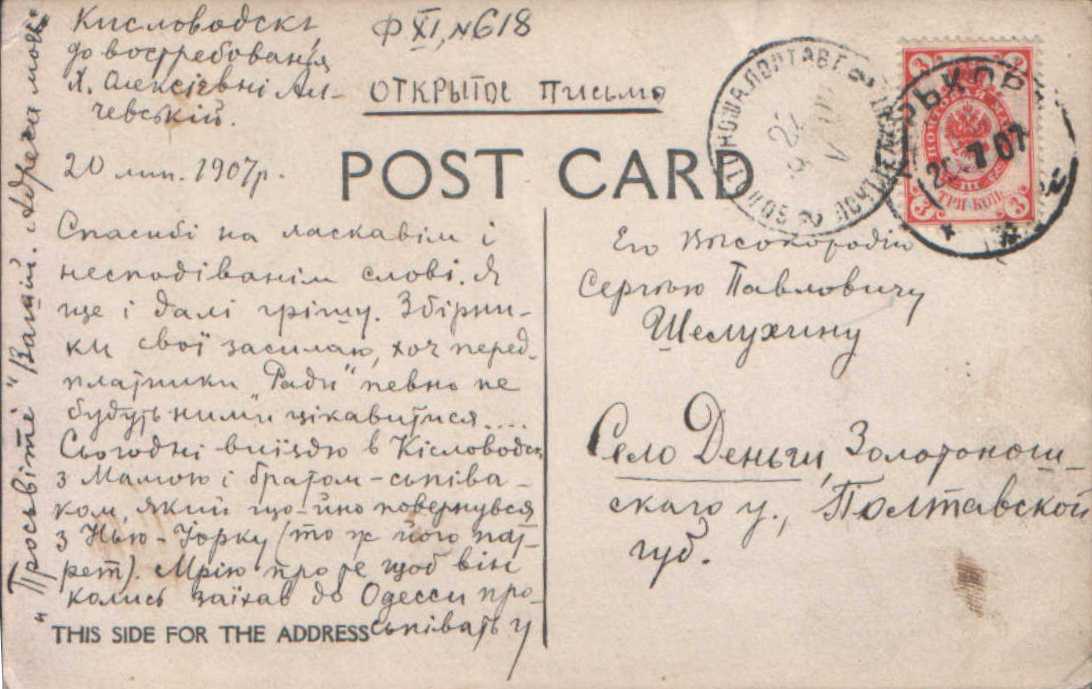 29–30. Алчевська Христина Олексіївна – Шелухину Сергію Павловичу. Листівка. З Кисловодська до с. Деньги, Золотоніського повіту. 20 липня 1907 р. Примітка: на звороті – репродукція світлини І. Алчевського – брата Х.О. Алчевської, оперного співака (ІР НБУВ, ф. ХІ, од. зб. 618).