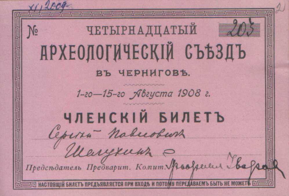 33. Членський квиток на ім’я Сергія Павловича Шелухина – делегата ХІV Археологічного зізду у Чернігові 1–15 серпня 1908 р. (ІР НБУВ, ф. ХІ, од. зб. 2009)