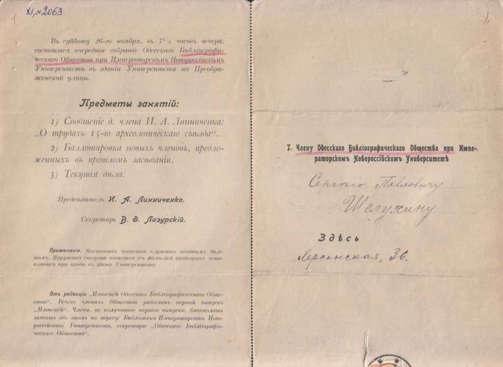 34. Линниченко І.А. Голова Одеського бібліографічного товариства при імп. Новоросійському університеті – С.П. Шелухину. Повідомлення про засідання товариства. Одеса. (ІР НБУВ, ф. ХІ, од. зб. 2063)