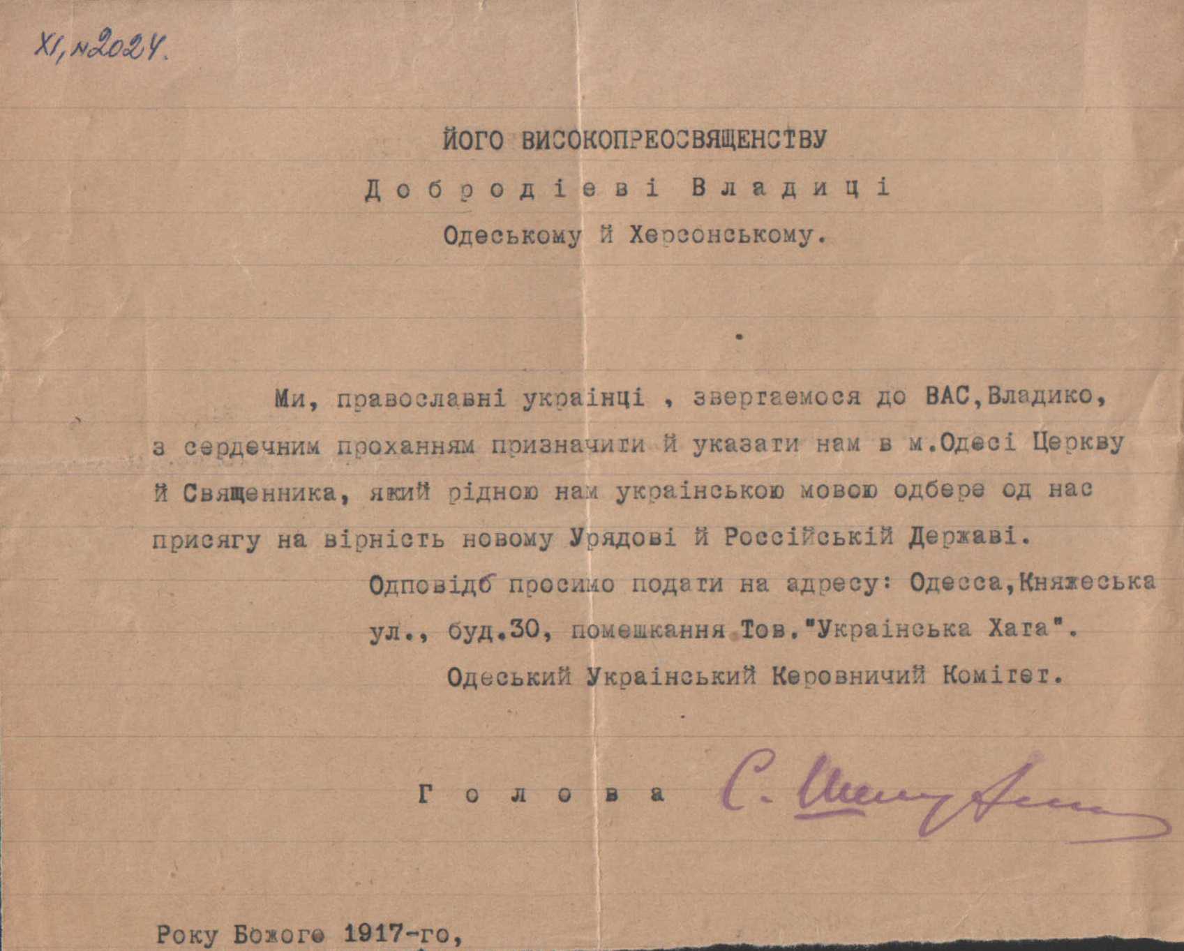 53. Шелухин [Сергій Павлович], голова Одеського українського керівничого комітету – Висопреосвященому владиці Одеському та Херсонському. Прохання комітету про визначення церкви та священика для складання рідною українською мовою «присяги на вірність новому урядові й російській державі». Одеса. 1917 р. 1 арк. (ІР НБУВ, ф. ХІ, од. зб. 2024)