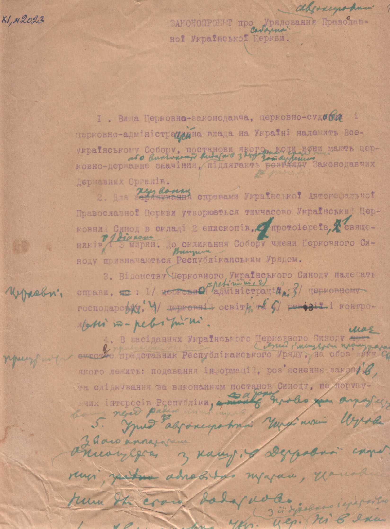 54. [Шелухин Сергій Павлович]. Законопроєкт про урядування автокефальної православної української соборної церкви. Чернетка з правками С.П. Шелухина. [Київ, 1918 р.] (ІР НБУВ, ф. ХІ, од. зб. 2023)