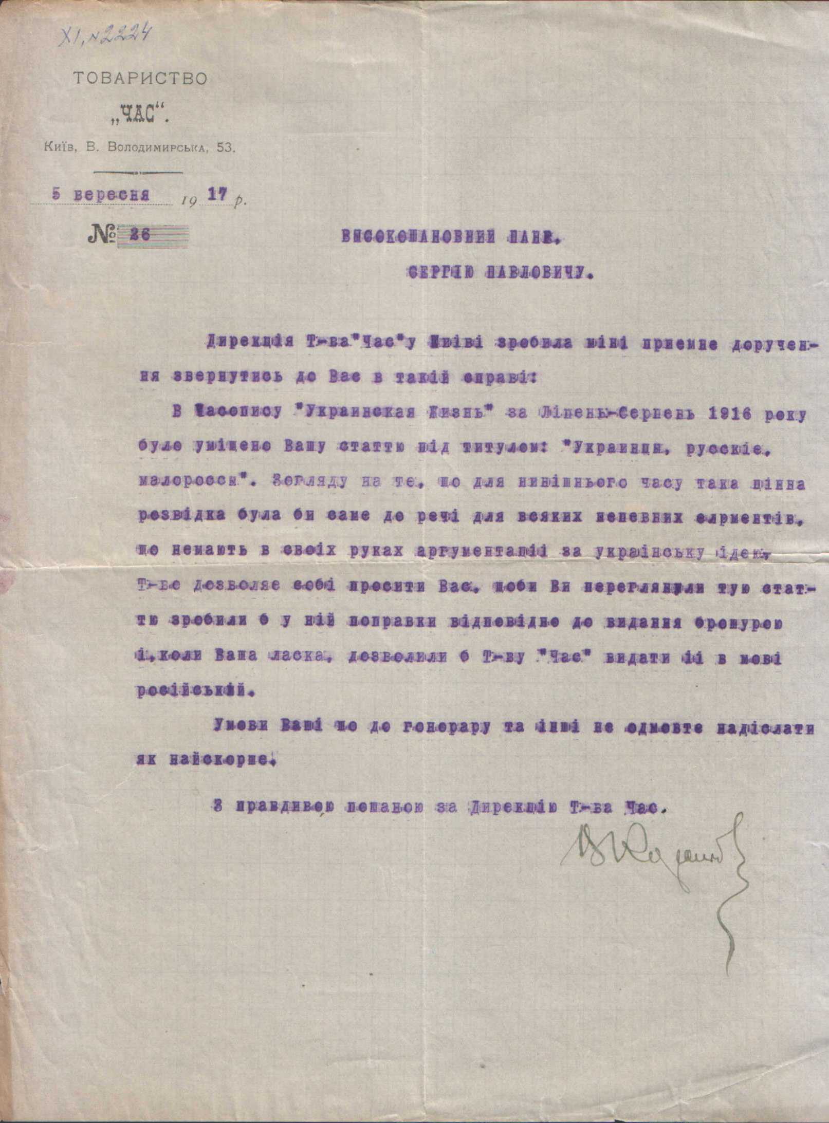 52. Редакція товариства «Час» – С.П. Шелухину. Лист щодо дозволу опублікувати статтю «Украинцы, русские, малороссы», раніше опубліковану у часописі «Украинская жизнь» (липень-серпень 1916). Київ, 5 вересня 1917 р. (ІР НБУВ, ф. ХІ, од. зб. 2224)