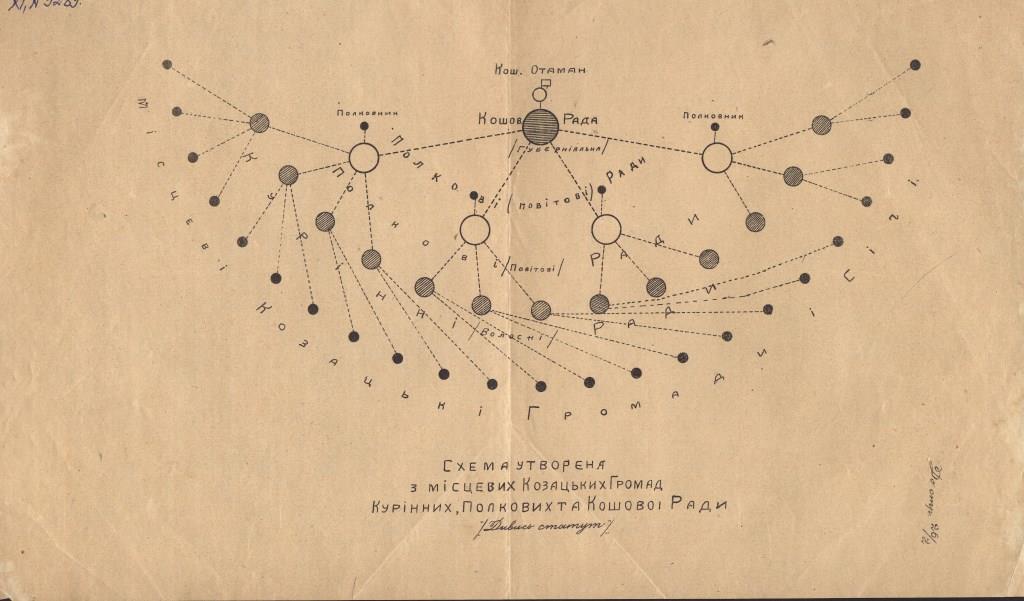 78. Схема утворення з місцевих козацьких громад курінних, полкових та кошевої Ради. [Київ, 1918 р.]. Друк. (ІР НБУВ, ф. ХІ, од. зб. 3289)