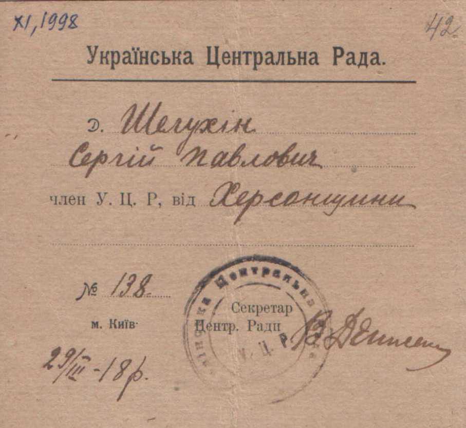 55. Українська Центральна Рада. Посвідчення члена Української Центральної Ради від Херсонщини – Шелухина Сергія Павловича. Київ, 22 березня 1918 р. (ІР НБУВ, ф. ХІ, од. зб. 1998)