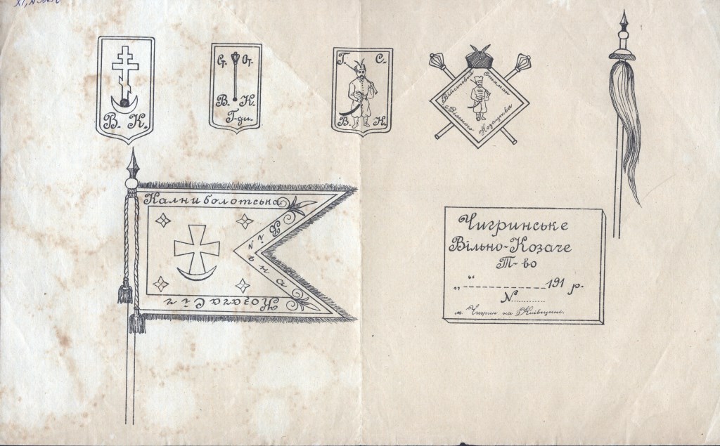 79. Чигиринське вільно-козаче товариство. Хоругва Калниболотської вільної козачої січі. Відзнака Військового отамана вільного козацтва. Інші відзнаки Вільного козацтва. Малюнок. Друк. Чигирин, [1918] р. (ІР НБУВ, ф. ХІ, од. зб. 3290)
