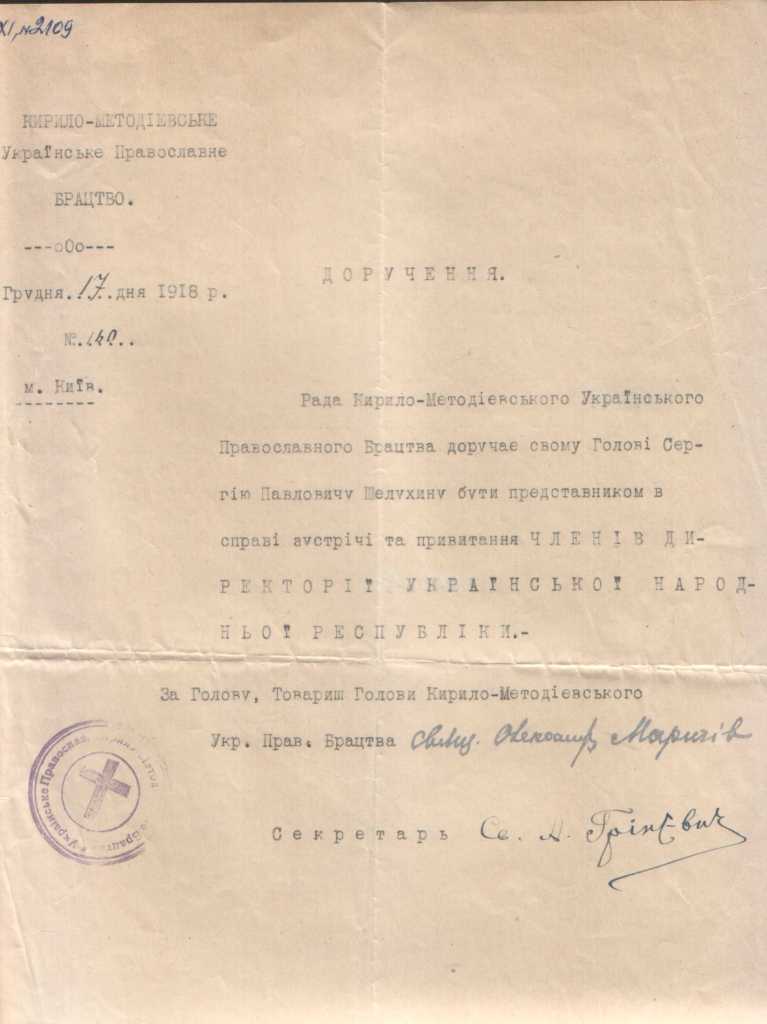 69. Олександр Маричів, товариш голови Кирило-Мефодіївського українського православного братства – Сергію Павловичу Шелухину, голові Кирило-Мефодіївського українського православного братства. Доручення бути представником на зустрічі з членами Директорії Української народної республіки. Авторизований машинопис. Київ, 17 грудня 1918 р. (ІР НБУВ, ф. ХІ, од. зб. 2109)