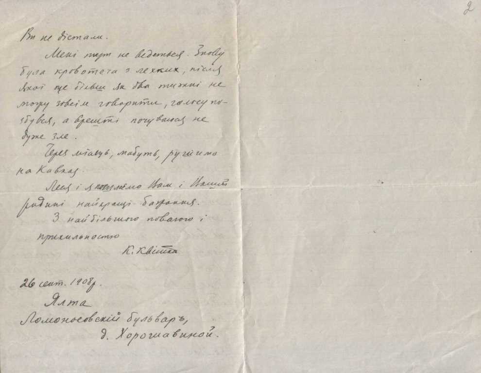 32. Квітка Климент Васильович – Шелухину Сергію Павловичу. Листи. З Ялти до Одеси. 26 вересня 1908 – 28 березня 1918 р. Примітка: у листі є згадка про стан здоров’я Лесі Українки (ІР НБУВ, ф. ХІ, од. зб. 988–990)