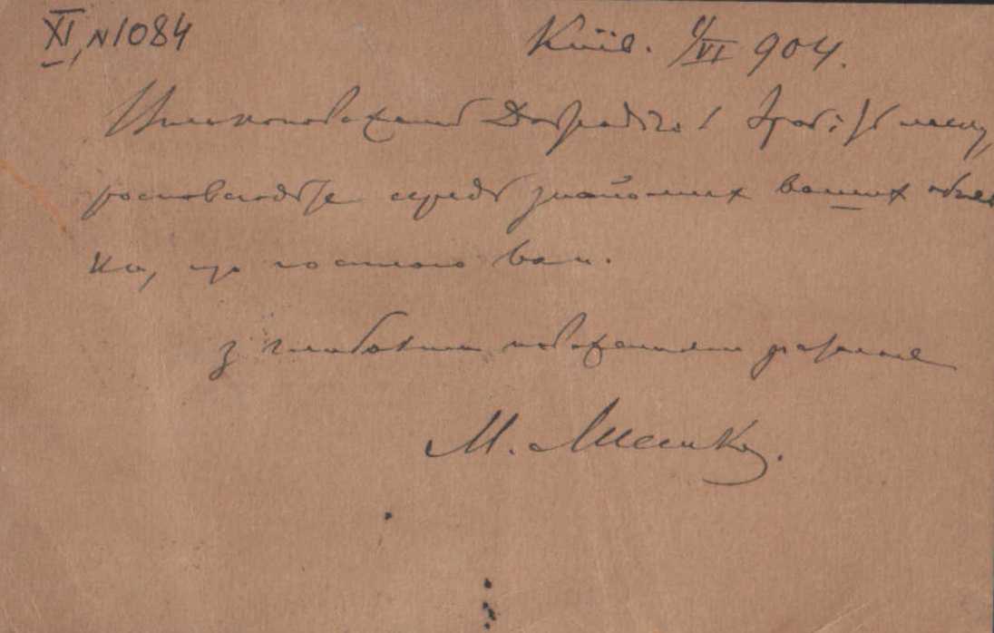 17. Лисенко Микола Віталійович – Шелухину Сергію Павловичу. Листівка. З Києва до Одеси, 1 червня 1904 р. (Інститут рукопису НБУВ, ф. ХІ, од. зб. 1084)