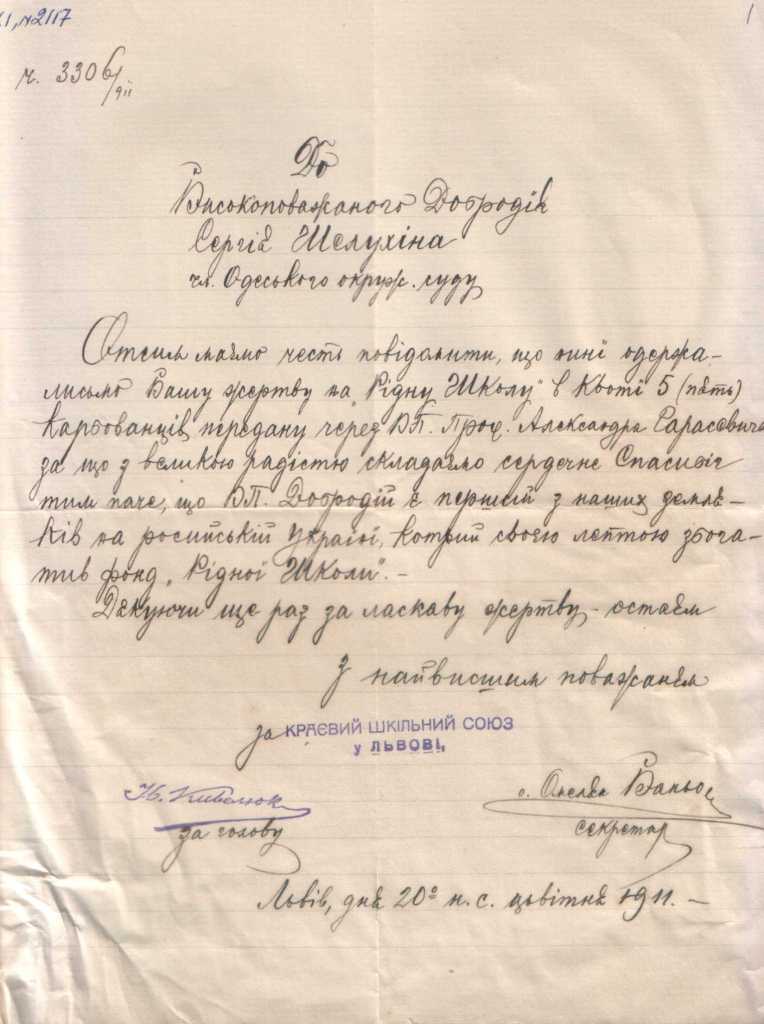 44. Ів. Кивелюк, голова Крайового шкільного союзу у Львові – С.П. Шелухину, члену Одеського окружного суду. Подяка за благодійний внесок на рахунок фонду «Рідна школа». Львів, 1911 р. (ІР НБУВ, ф. ХІ, од. зб. 2117)