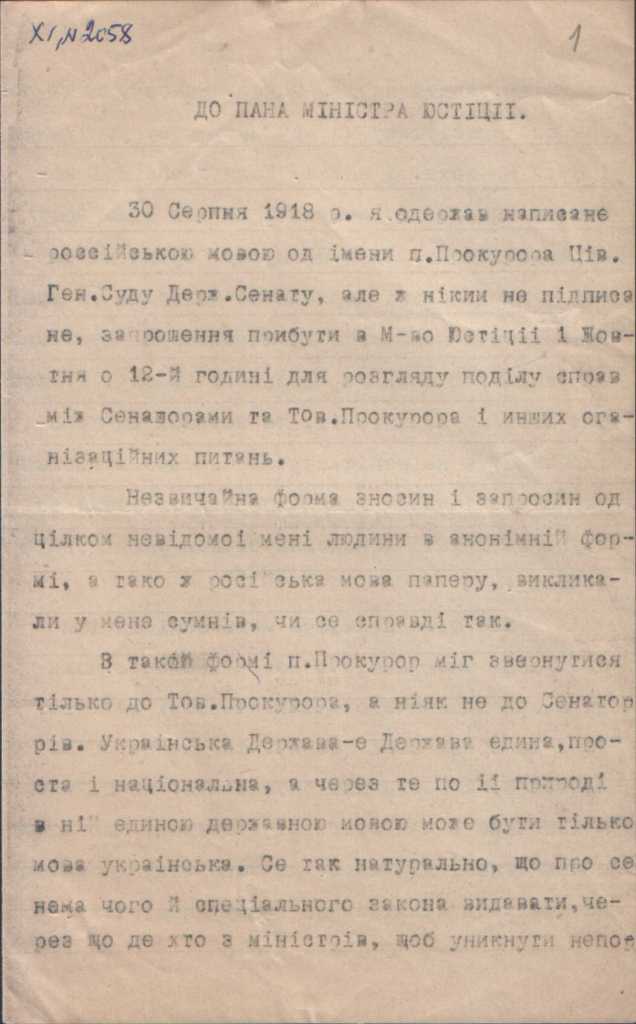 65. [Шелухин Сергій Павлович], сенатор Цивільного Генерального суду Державного сенату Української Держави – [А. Романову], міністру юстиції. Лист про недопустимість вживання іншої мови крім української у листуванні між службовцями уряду Української Держави. [Київ, вересень 1918 р.] 2 арк. (ІР НБУВ, ф. ХІ, од. зб. 2058)