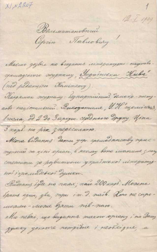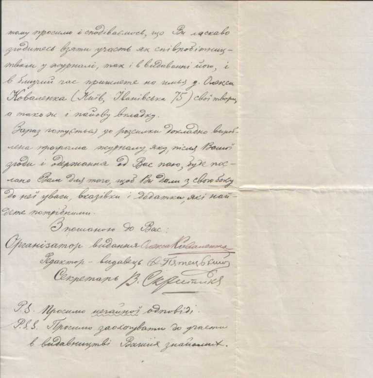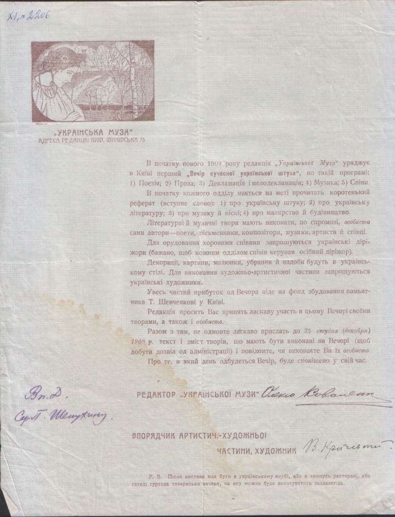 36. Олекса Коваленко, Василь Кричевський – С.П. Шелухину. Запрошення взяти участь у «Вечорі сучасної штуки», організованого редакцією «Українська муза» в Києві наприкінці січня 1909 р. Київ. (ІР НБУВ, ф. ХІ, од. зб. 2206)