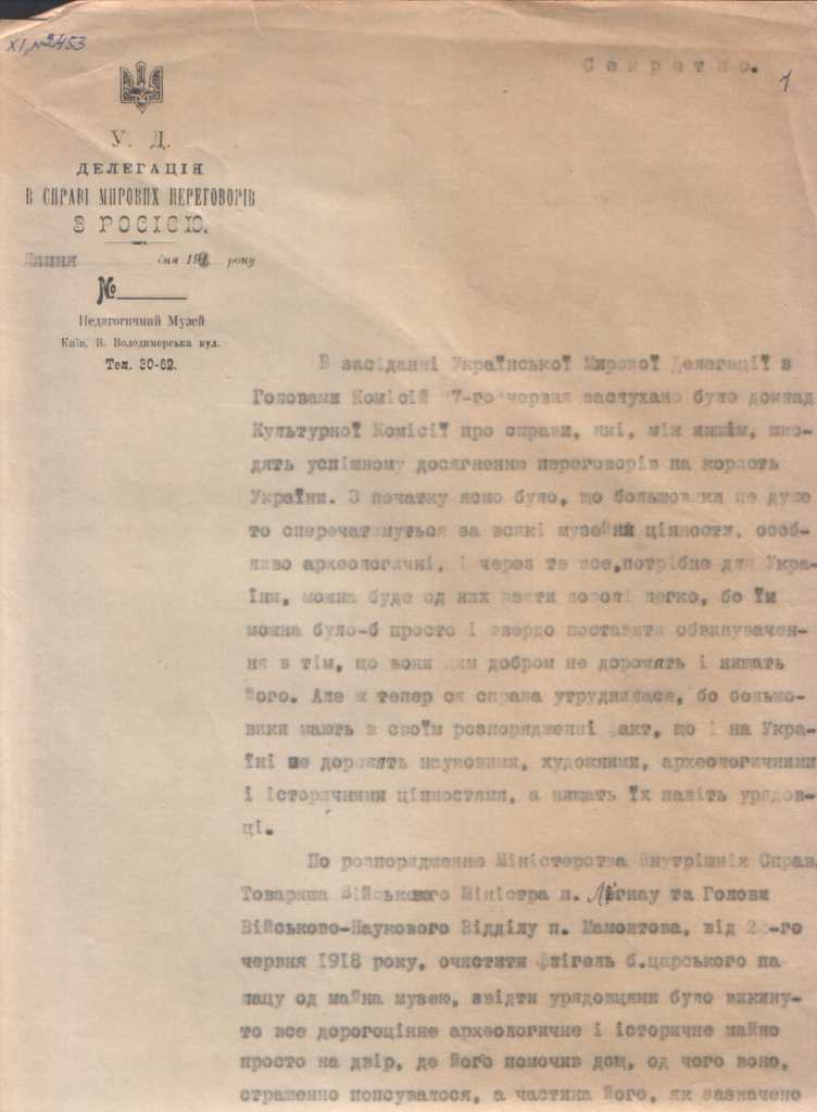 56. Доповідна записка під грифом «Секретно» голови делегації в справі мирових переговорів з росією С.П. Шелухина щодо засідання в справі повернення з росії музейних цінностей України. У документі згадується про ганебний випадок псування майна Державного військово-історичного музею за розпорядженням міністра внутрішніх справ, військового міністра та голови військового наукового відділу. Київ, 22 червня 1918 р. (ІР НБУВ, ф. ХІ, од. зб. 2453)