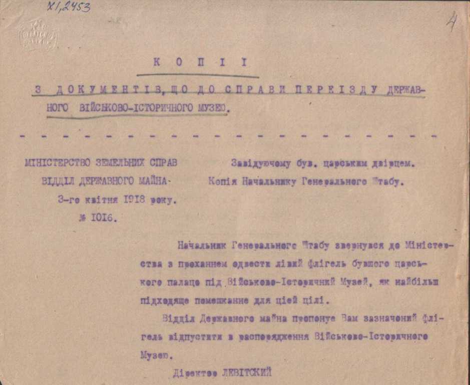 57. Копії документів щодо справи переїзду Державного військово-історичного музею до флігелю колишнього царського палацу. Київ, 3 квітня 1918 р. (ІР НБУВ, ф. ХІ, од. зб. 2453)