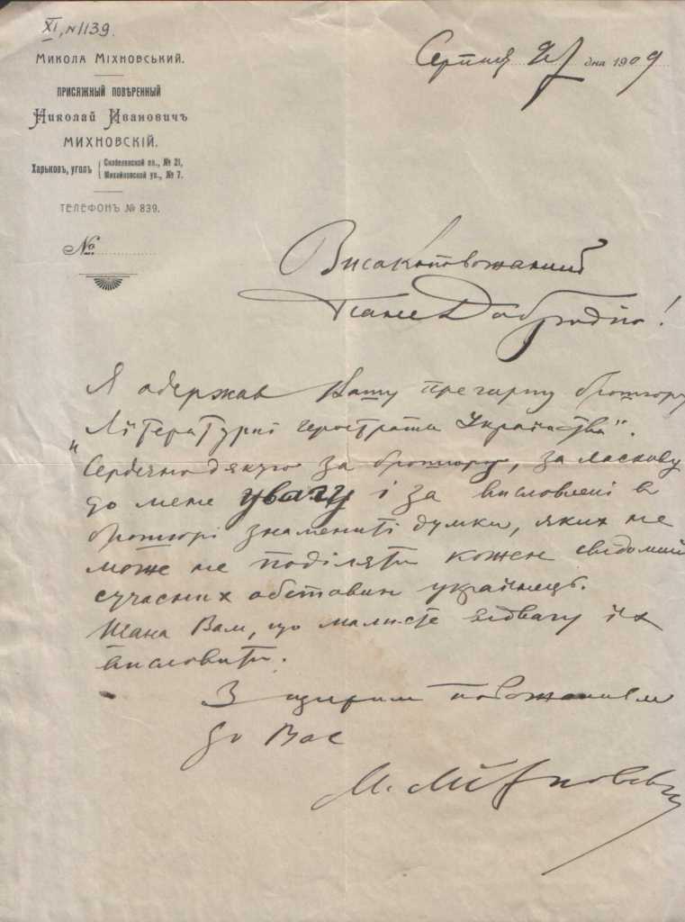 35. Міхновський Микола Іванович, присяжний повірений – Шелухину Сергію Павловичу. Лист зі схвальним відгуком на брошуру С.П. Шелухина «Літературні герострати України». З Харкова до Одеси. 27 серпня 1909 р. (ІР НБУВ, ф. ХІ, од. зб. 1139)