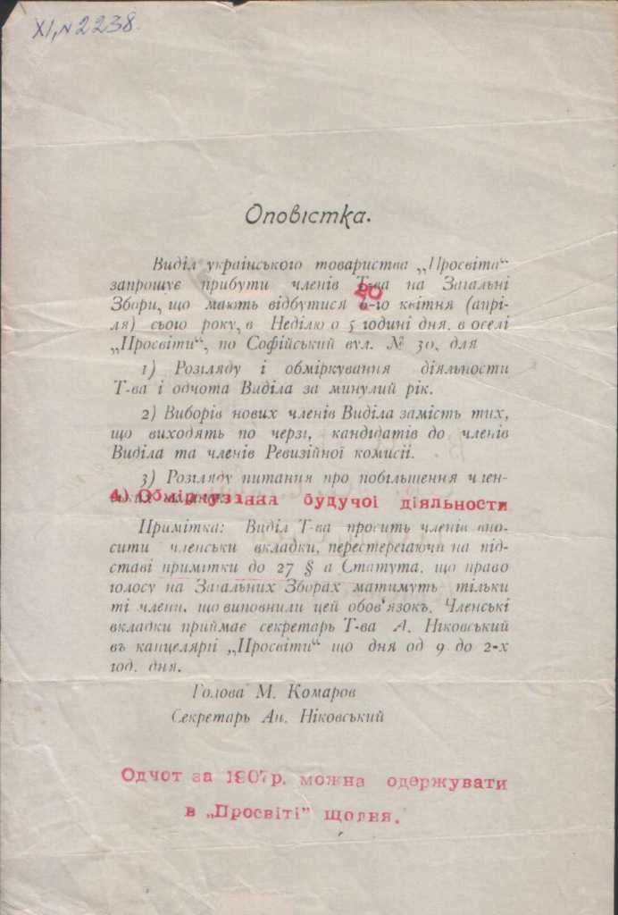 19. Запрошення на загальні збори членів Одеського відділу Товариства «Просвіта». Одеса, 1907 р. (ІР НБУВ, ф. ХІ, од. зб. 2238)