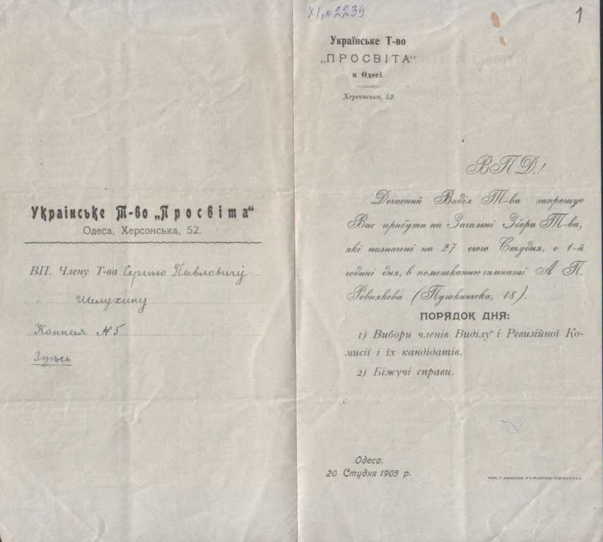 20. Запрошення на загальні збори членів Одеського відділу Товариства «Просвіта». Одеса, 20 січня 1905 р. (ІР НБУВ, ф. ХІ, од. зб. 2239)