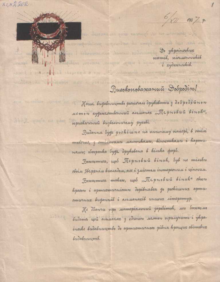 27. Лист редакції художнього альманаху «Терновий вінок». Київ, 6 грудня 1907 р. (ІР НБУВ, ф. ХІ, од. зб. 2202)