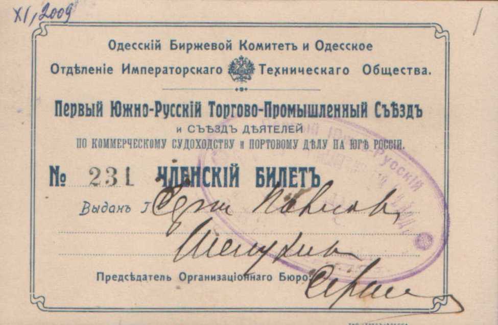 40. Членський квиток на ім’я Шелухина Сергія Павловича для відвідування засідань Першого Південно-Російського Торгово-Промислового з’їзду та з’їзду діячів комерційного судноплавства на Півдні росії. Друк. Рос. мовою. Одеса (ІР НБУВ, ф. ХІ, од. зб. 2009)