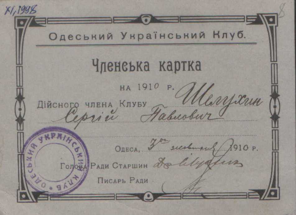 41. Членська картка на 1910 р. дійсного члена Одеського Українського клубу Шелухина Сергія Павловича. Одеса, 3 жовтня 1910 р. (ІР НБУВ, ф. ХІ, од. зб. 1998)